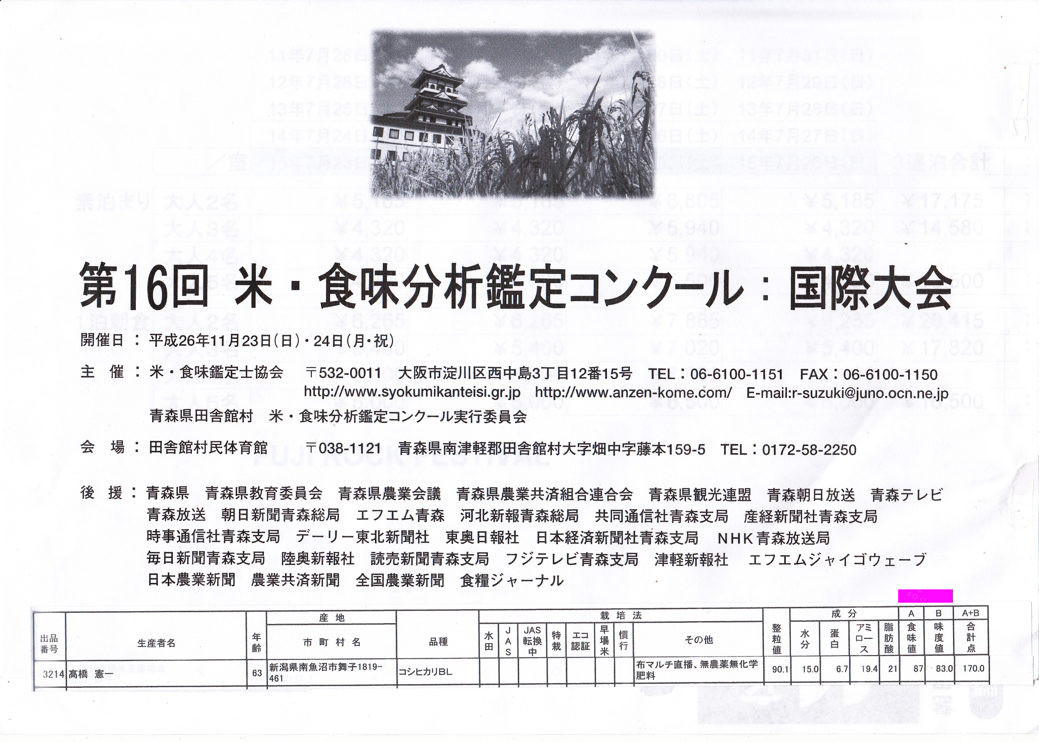 定コンクール」に出品、食味値87点・味度値83点と90点には及ばず、悔しい思いをしました。