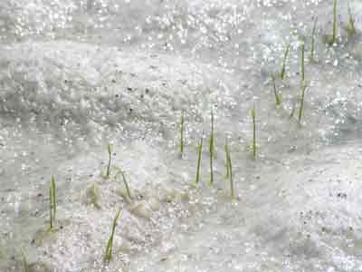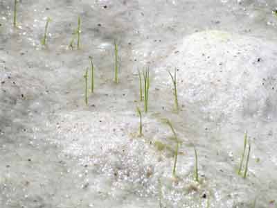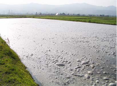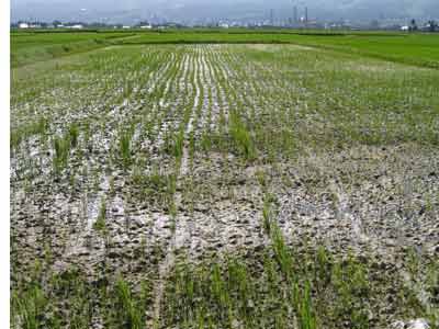 手前稲の無いところは発芽当時の水管理不良 ところどころ倒伏は着土不十分 |