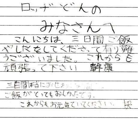 帰り際に渡されたメモ=ロッヂどんの勲章です